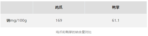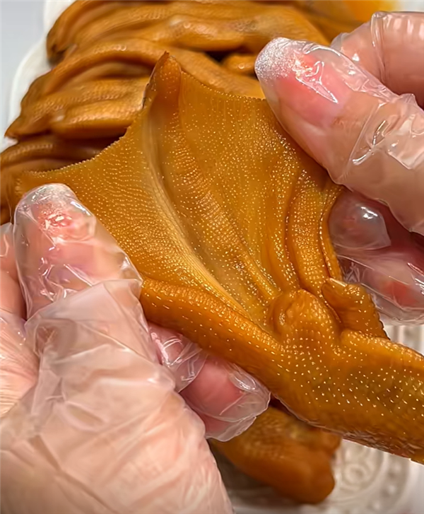 对于需要控血压的人群来说,同样的烹饪体例下,和鸡爪比拟,选择鸭掌对维持血压健康更为敌对一些。正在其他养分成分上,鸡爪的钾含量、硒含量较着高于鸭掌,别离是鸭掌的 4 倍、1。8 倍。[1]网上曾报道过有一些不良商贩利用过氧化氢对鸡爪、鸭掌等进行漂白,是由于添加过氧化氢不只能杀菌耽误保质期,还能去除鸡爪、鸭掌经煮制残留的血渍、也能去除爪子本身的微,使鸡爪、鸭掌显得又白又大。可是颠末过氧化氢溶液浸泡后的鸡爪和鸭掌,不只养分成分会遭到,还会对健康发生风险,毁伤胃黏膜。[2]按照我国 GB 2760-2024《食物添加剂利用尺度》,不答应利用过氧化氢漂白鸡爪、鸭掌,只答应利用正在某些特定的加工环节中。优良鸭掌弹性好,按压后能快速回弹,申明鸭掌很新颖。若是摸起来发黏、软烂,捏一下会构成凹陷的坑,弹性很差,那就曾经不新颖了。凡是环境下,泡椒风味的鸡爪和鸭掌盐含量可能更高。好比下图这款泡椒味鸭爪,4~5个鸭掌下肚大约就是 100 克,将会摄入 1488 毫克钠,折算成盐约为 3。7 克。